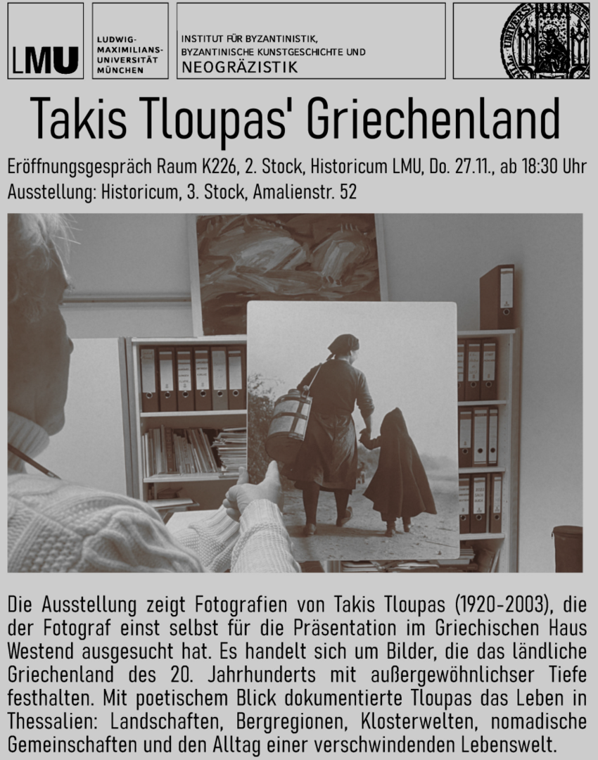 Με αφετηρία τις φωτογραφίες του Τάκη Τλούπα, θα συζητηθεί πώς αυτή η ιδιαίτερη συλλογή έφτασε στο Μόναχο και ποιον ρόλο διαδραμάτισε το Ελληνικό Σπίτι ως τόπος πολιτισμικής δράσης.