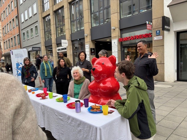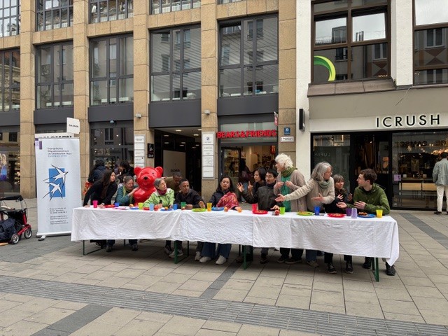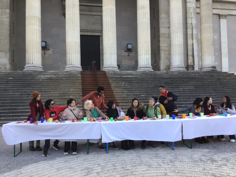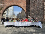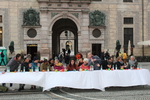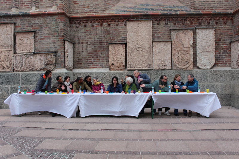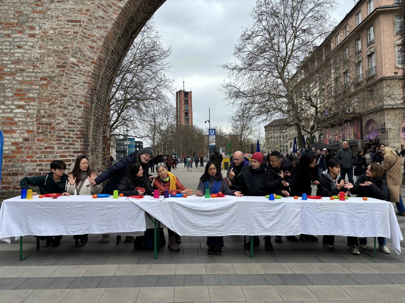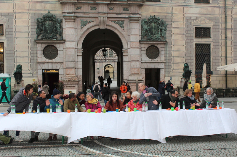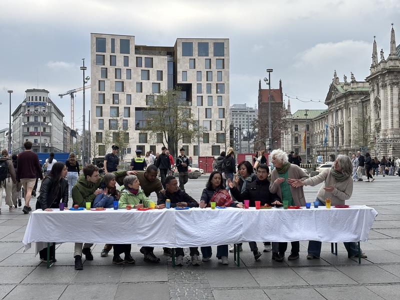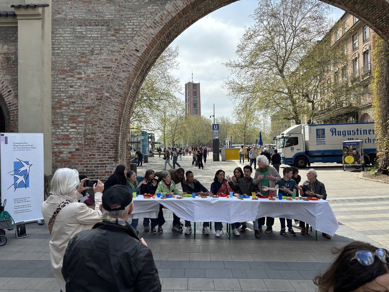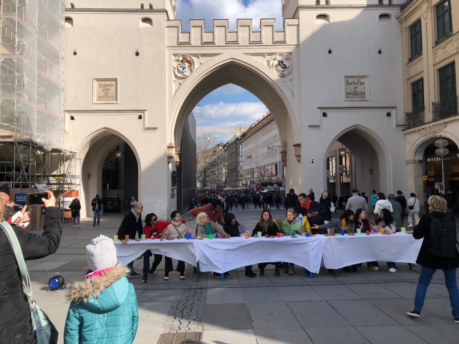 Am Gründonnerstag, dem Donnerstag vor Ostern, zeigen wir als Lebendes Bild in der Münchner Innenstadt, dass es gut ist, wenn Menschen aus aller Welt in Frieden zusammen essen.